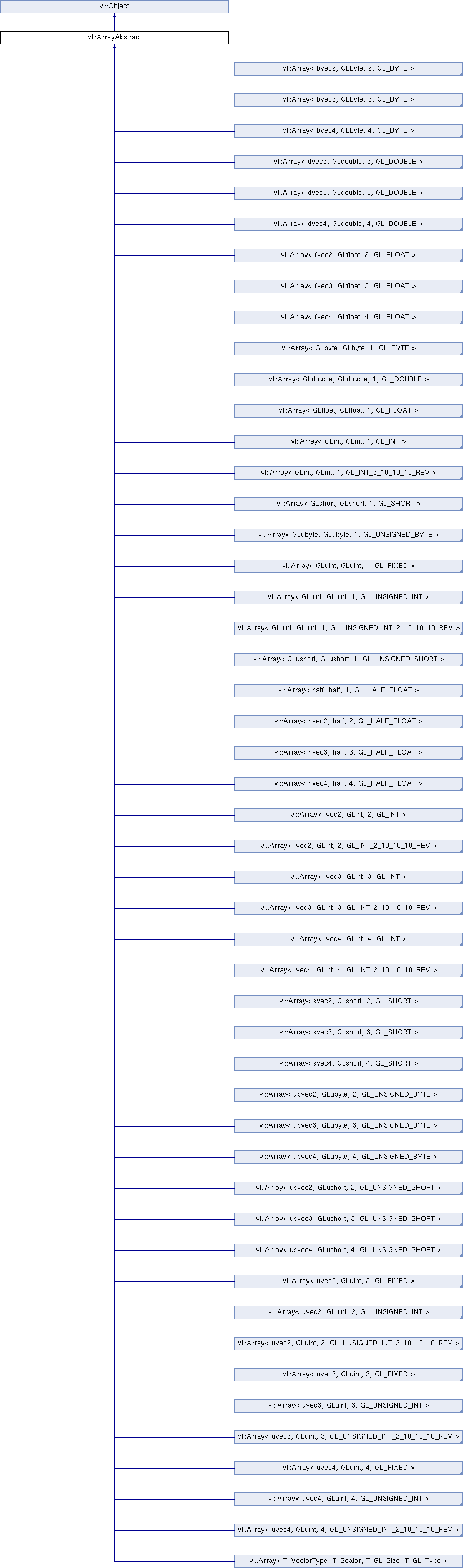 Implemented in vl::Array< T_VectorType, T_Scalar, T_GL_Size, T_GL_Type >, vl::Array< uvec4, GLuint, 4, GL_FIXED >, vl::Array< uvec2, GLuint, 2, GL_FIXED >, vl::Array< ubvec4, GLubyte, 4, GL_UNSIGNED_BYTE >, vl::Array< ubvec2, GLubyte, 2, GL_UNSIGNED_BYTE >, vl::Array< svec4, GLshort, 4, GL_SHORT >, vl::Array< svec2, GLshort, 2, GL_SHORT >, vl::Array< GLshort, GLshort, 1, GL_SHORT >, vl::Array< uvec4, GLuint, 4, GL_UNSIGNED_INT >, vl::Array< ivec3, GLint, 3, GL_INT_2_10_10_10_REV >, vl::Array< GLuint, GLuint, 1, GL_FIXED >, vl::Array< uvec2, GLuint, 2, GL_UNSIGNED_INT >, vl::Array< GLuint, GLuint, 1, GL_UNSIGNED_INT >, vl::Array< hvec3, half, 3, GL_HALF_FLOAT >, vl::Array< hvec2, half, 2, GL_HALF_FLOAT >, vl::Array< uvec3, GLuint, 3, GL_FIXED >, vl::Array< dvec4, GLdouble, 4, GL_DOUBLE >, vl::Array< ivec3, GLint, 3, GL_INT >, vl::Array< ivec2, GLint, 2, GL_INT >, vl::Array< GLbyte, GLbyte, 1, GL_BYTE >, vl::Array< uvec2, GLuint, 2, GL_UNSIGNED_INT_2_10_10_10_REV >, vl::Array< dvec3, GLdouble, 3, GL_DOUBLE >, vl::Array< GLdouble, GLdouble, 1, GL_DOUBLE >, vl::Array< uvec3, GLuint, 3, GL_UNSIGNED_INT >, vl::Array< GLint, GLint, 1, GL_INT >, vl::Array< ubvec3, GLubyte, 3, GL_UNSIGNED_BYTE >, vl::Array< ivec4, GLint, 4, GL_INT >, vl::Array< usvec4, GLushort, 4, GL_UNSIGNED_SHORT >, vl::Array< usvec2, GLushort, 2, GL_UNSIGNED_SHORT >, vl::Array< uvec4, GLuint, 4, GL_UNSIGNED_INT_2_10_10_10_REV >, vl::Array< GLubyte, GLubyte, 1, GL_UNSIGNED_BYTE >, vl::Array< usvec3, GLushort, 3, GL_UNSIGNED_SHORT >, vl::Array< half, half, 1, GL_HALF_FLOAT >, vl::Array< GLuint, GLuint, 1, GL_UNSIGNED_INT_2_10_10_10_REV >, vl::Array< dvec2, GLdouble, 2, GL_DOUBLE >, vl::Array< fvec3, GLfloat, 3, GL_FLOAT >, vl::Array< hvec4, half, 4, GL_HALF_FLOAT >, vl::Array< ivec4, GLint, 4, GL_INT_2_10_10_10_REV >, vl::Array< ivec2, GLint, 2, GL_INT_2_10_10_10_REV >, vl::Array< GLushort, GLushort, 1, GL_UNSIGNED_SHORT >, vl::Array< uvec3, GLuint, 3, GL_UNSIGNED_INT_2_10_10_10_REV >, vl::Array< GLfloat, GLfloat, 1, GL_FLOAT >, vl::Array< GLint, GLint, 1, GL_INT_2_10_10_10_REV >, vl::Array< fvec4, GLfloat, 4, GL_FLOAT >, vl::Array< fvec2, GLfloat, 2, GL_FLOAT >, vl::Array< svec3, GLshort, 3, GL_SHORT >, vl::Array< bvec4, GLbyte, 4, GL_BYTE >, vl::Array< bvec3, GLbyte, 3, GL_BYTE >, and vl::Array< bvec2, GLbyte, 2, GL_BYTE >.