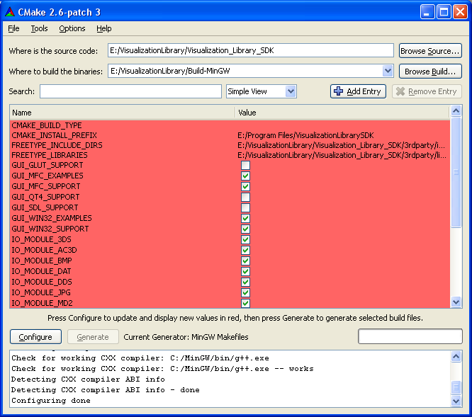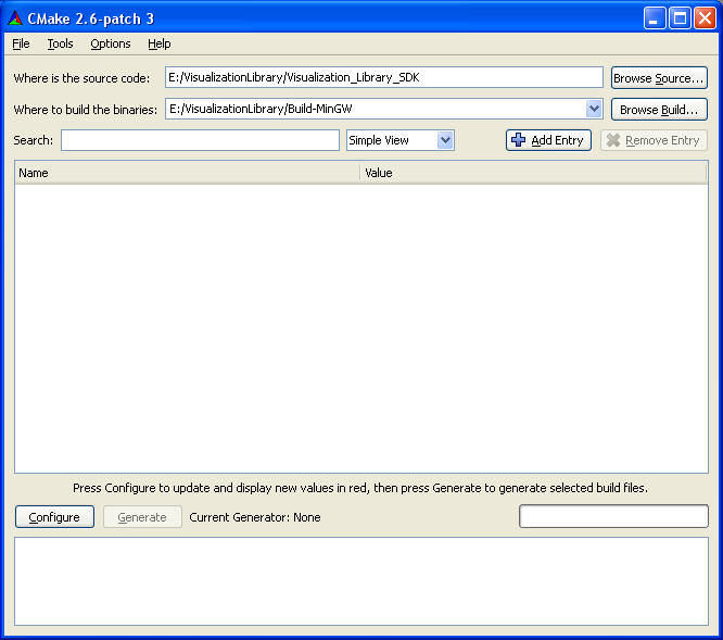 - a source directory: the directory where Visualization Library sources are located (containing the main CMakeLists.txt)